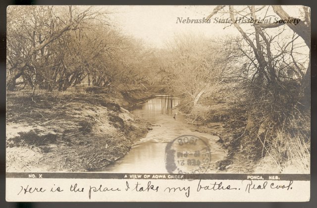 | 07:27, 16 January 2018 | Ponca Postcard.jpg (file) | 83 KB | Information = A picture postcard of Aowa Creek near Ponca, NE Description = A picture postcard of Aowa Creek near Ponca, NE. Source = RG3346 Dixon County (Nebraska), Nebraska State Historical Society Date = 1908 Author = Unknown Permission = Cont... | 1 | |
