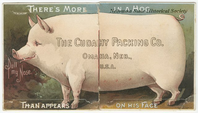 | 08:21, 16 January 2018 | Cudahy Meat Pull Out Hog.jpg (file) | 62 KB | Information = Card, Trade; Cudahy Meat, Pull-Out Hog Description = Trading card from the Cudahy Packing Company. It features a picture of a hog , that pulls apart to reveal hanging pork cuts and a can of lard in the middle. Source = Svoboda, Jerry a... | 1 | |