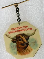 | 08:20, 16 January 2018 | Celluloid Tag South Omaha.jpg (file) | 50 KB | Information = Tag, Celluloid; Ship Your Livestock to South Omaha, Cow Head on Reverse Description = Celluloid tag. Octogon shape with metal chain and bar. “Ship Your Livestock to South Omaha” There is an illustration of a longhorn cow head on the... | 1 | |