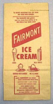 | 08:40, 16 January 2018 | Ice Cream Insulated Bag.jpg (file) | 34 KB | Information = Insulated Bag for Fairmont Ice Cream Description = Starting as a small butter producer in 1884, the Fairmont Creamery Company grew to become one of the nation's largest food processors, Fairmont Foods. By 1959, with its headquarters in O... | 1 | |