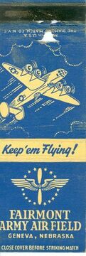| 08:38, 16 January 2018 | Fairmont Army Airfield Matchbook cover.jpg (file) | 47 KB | Information = Matchbook; Fairmont Army Airfield, Geneva, Nebraska Description = Matchbook cover advertising the Fairmont Army Airfield, Geneva, Nebraska; Matchbook for Fairmont Army Air Base. Source = State Historic Preservation Office, Nebraska Stat... | 1 | |