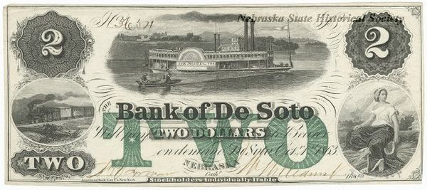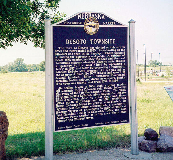 The town of DeSoto was platted on this site in 1854 and incorporated in 1855. Steamboating on the Missouri was then in its heyday. DeSoto provided a landing for passengers and goods. A number of boats sank nearby, notably the Cora and Bertrand. Ambitious citizens advanced plans to make DeSoto a "gateway to the West" - first by operating a ferry in 1857 and later by promoting a railroad to connect DeSoto with Fremont. A track was laid as far as present Blair. By 1857 DeSoto had grown to several hundred. Fifteen businesses flourished, including hotels, saloons, stores, newspapers, banks. The town was county seat from 1858 to 1866. Its decline began in 1859 with a great exodus of residents to the Colorado gold fields. Following the Panic of 1857 its three banks closed. The Sioux City and Pacific Railroad, after buying the DeSoto line's franchise, chose to cross the river three miles north of DeSoto and in 1869 established Blair. DeSoto's hopes for growth were blasted. Its citizens left for other communities, a number to become figures of prominence in judicial, political, and financial circles in Nebraska. Today the Fort Calhoun Power Station is in the area where once flowed the Missouri River.
