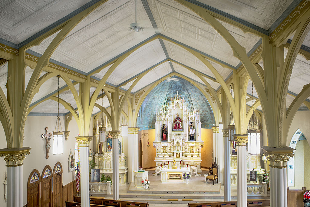Revision as of 13:27, 28 September 2022 by DMurphy (Talk | contribs) (Blessed Trinity Catholic Church '''Description:''' Blessed Trinity Czech Catholic Church (1903-1909), Brainard, Nebraska. (''Novy Kostel Nejsvetejsi Trojice'') '''James Henry Craddock (1856-1932), Architect'''. View of the interior looking north f...)