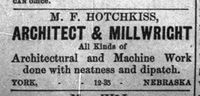 6. "M. F. Hotchkiss, Architect & Millwright" (advertisement), The York (Nebraska) Republican (December 21, 1887), 1.