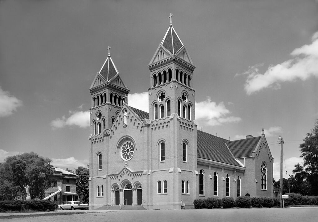Description: Ecclesia St. Bonaventure Catholic Church, Raeville, Boone County, Nebraska; 1917-1919; BO09-001; Jacob M. (James) Nachtigall (1874-1947), Architect; general view showing west and south facades looking northeast with school building in background at left. Also see the interior view.