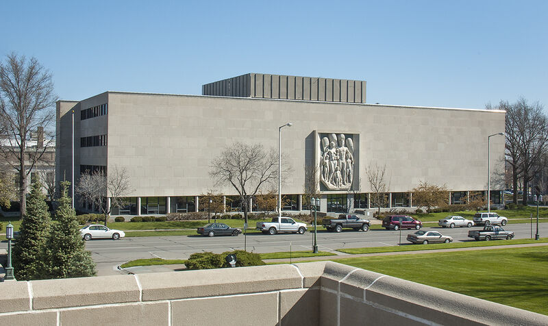 Description: Woodman Accident & Life Insurance Company Building (1953-1954), 16th & K, Lincoln, Nebraska. Davis & Wilson, Architects. Woodrow Hull, designer. (North addition, 1968, also by Davis & Wilson.) Protecting hand sculpture. View of south facade, looking northeast from the capitol terrace. (LC13:D08-011)