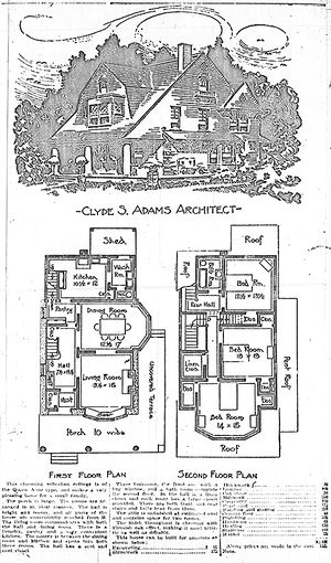 a. In 1907 and 1908, Omaha World-Herald published at least five house designs by "Clyde S. Adams," including each time a perspective sketch, two floor plans, and brief commentary with "itemized cost of construction."[1][5-8] The Omaha (Nebraska) Daily Bee ran "Clyde Smith Adams" designs approximately 3 dozen times between 1919 and 1921, and the (Lincoln) Nebraska State Journal published Adams' house designs at least twice, in 1921 and 1922.[9][10]