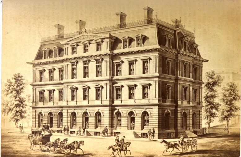 Heading: "U. S. Custom House and Post OFfice, Omaha, Neb." Description: Perspective view of three-story-plus-Mansard French 2nd Empire public building for Omaha, Nebraska, designed by Supervising Architect of the Treasury A. B. Mullett Date: 1871 Source: Annual Report of the Supervising Architect of the Treasury for the Year 1871 (Washington: Government Printing Office), 1871, opp. p. 8. Rights Usage Terms: Public, non-commercial use, with credit, is granted file names ending in ‘w’ no derivatives.