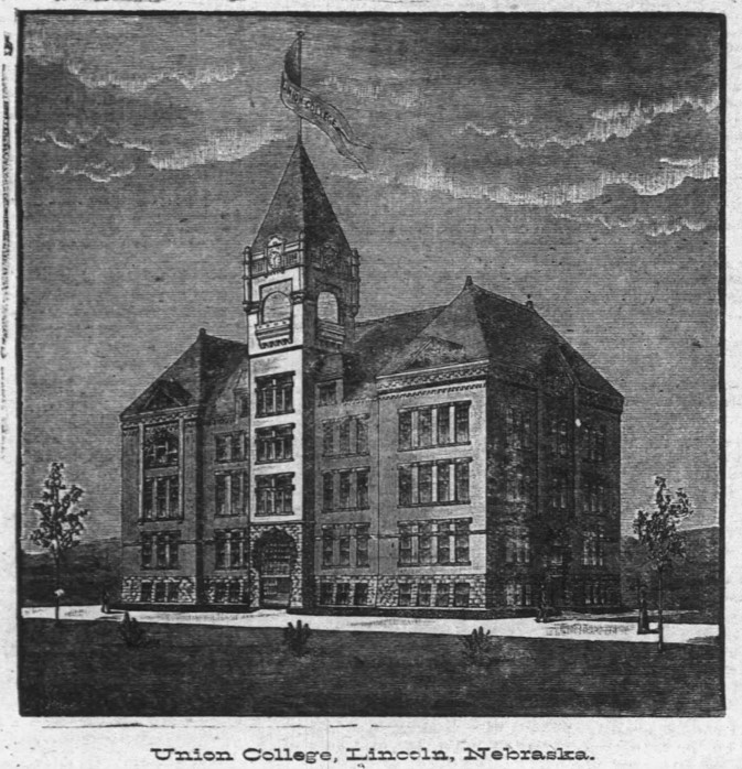 Heading: Union College, Main Building, College View, Nebraska. Description: Perspective view from southwest for Main Building, Union College, College View, Nebraska, designed and built by William Conqueror Sisley. Date: 1890 Source: Lincoln Evening News (August 19, 1890), 3. Rights Usage Terms: Public, non-commercial use, with credit, is granted file names ending in ‘w’ no derivatives.