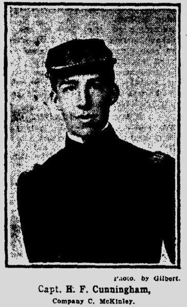 Heading: "Capt. H. F. Cunningham, Company F, McKinley [High School]" Description: Portrait of Cadet Captain H. F. Cunningham, Washington, D.C. Date: 1905 Credit: "Photo by Gilbert" Source: The Washington (D.C.) Post (May 25, 1905), 10. Rights Usage Terms: Public, non-commercial use, with credit, is granted file names ending in ‘w’ no derivatives.
