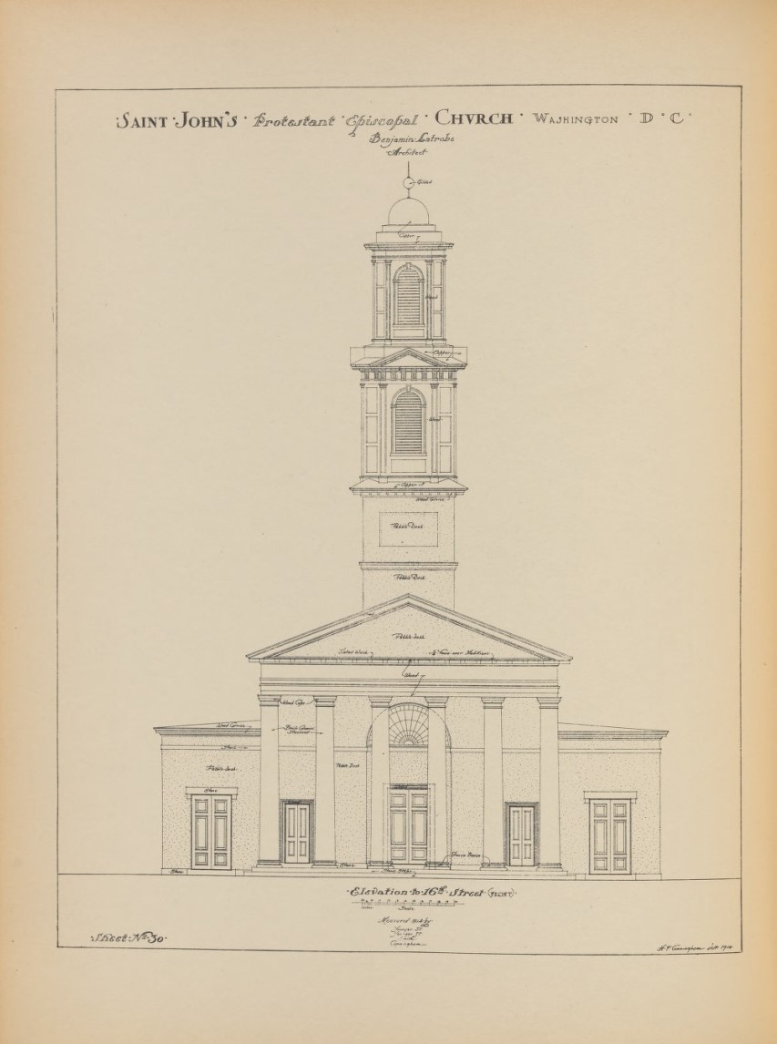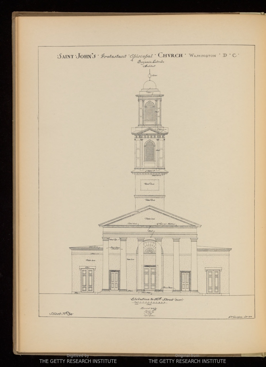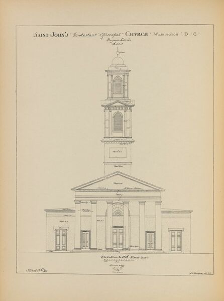 Heading: "Saint John's Protestant Episcopal Church, Washington, D.C." Description: "Elevation to 16th Street (Front)" of church designed by Benjamin Henry Latrobe. Date: Drawn 1914 Credit: H. F. Cunningham. Source: Harry Francis Cunningham, Joseph Arthur Younger, [and] J. Wilmer Smith. Measured Drawings of Georgian Architecture in the District of Columbia, 1750-1820. Washington: Architectural Book Publishing Co., 1914. . Rights Usage Terms: Public, non-commercial use, with credit, is granted file names ending in ‘w’ no derivatives.