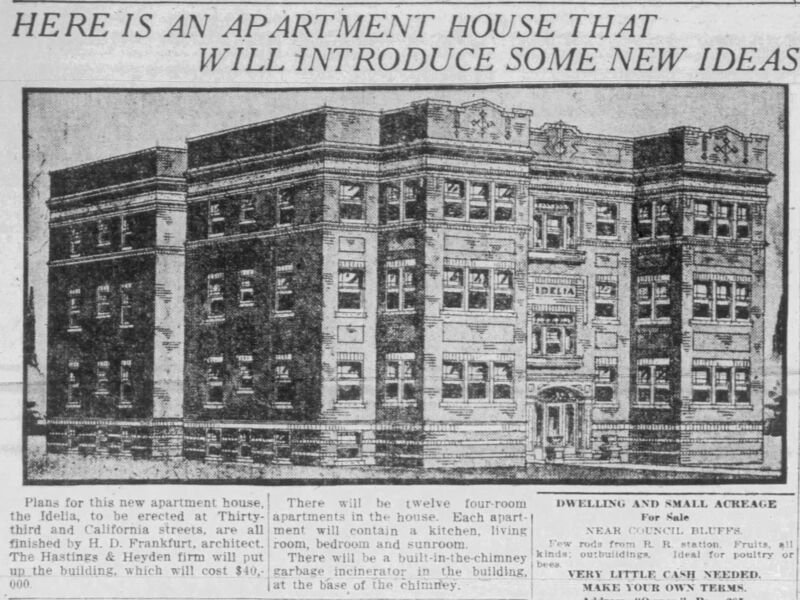 Heading: Proposal sketch for "The Idelia," 33rd & California Streets, Omaha, Nebraska. Description: Perspective sketch by H. D. Frankfurt for 12-unit "Idelia" apartment house for Hastings & Heyden Date: 1916 Credit: H. D. Frankfurt Source: Omaha (Nebraska) Daily News (February 20, 1916), 4D. Rights Usage Terms: Public, non-commercial use, with credit, is granted file names ending in ‘w’ no derivatives.