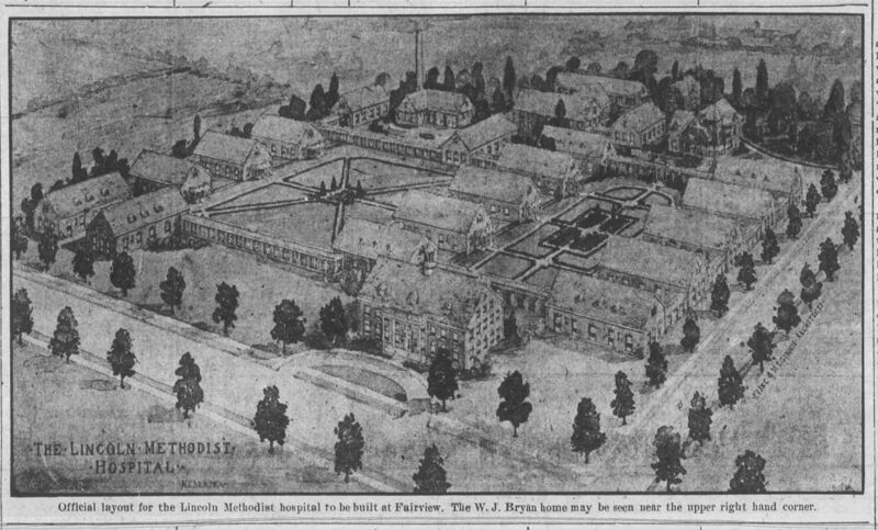 Heading: The Lincoln Methodist Hospital, Lincoln, Nebraska Description: Aerial perspective from southwest showing proposed hospital, designed by Lincoln architects Fiske & Meginnis Date: 1924 Credit: Fiske & Meginnis, Architects. Source: (Lincoln) Nebraska State Journal (April 6, 1924), 1. Rights Usage Terms: Public, non-commercial use, with credit, is granted file names ending in ‘w’ no derivatives.