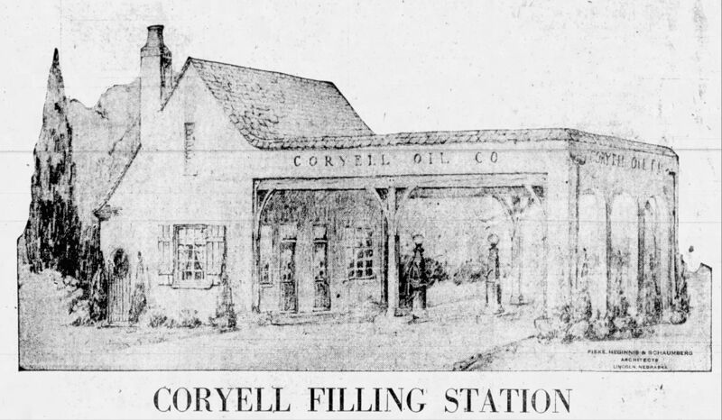 Heading: "Coryell Filling Station," Normal Blvd. and South St., Lincoln, Nebraska. Description: Perspective sketch of small gas station with canopy, designed by Lincoln architects Fiske, Meginnis & Schaumberg Date: 1925 Credit: Fiske, Meginnis & Schaumberg Source: (Lincoln) Nebraska State Journal (May 24, 1925), 16. Rights Usage Terms: Public, non-commercial use, with credit, is granted file names ending in ‘w’ no derivatives.