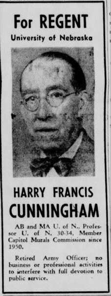 Heading: Harry Francis Cunningham, candidate for University of Nebraska Board of Regents. Description: Political advertisement for retired architect and Board of Regents candidate H. F. Cunningham. Date: 1954 Source: Lincoln (Nebraska) Star (August 8, 1954), 6. Rights Usage Terms: Public, non-commercial use, with credit, is granted file names ending in ‘w’ no derivatives.