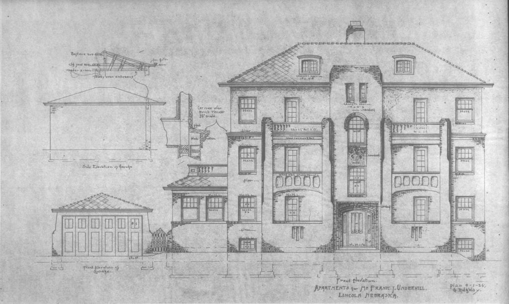 Heading: Elevation for Underhill (a.k.a. "Minuet") Apartments. Description: East elevation for apartment house, 805 South 18th Street, Lincoln, Nebraska, '''George G. Ridgway (1868-1963), Builder & Architect'''. Date: 1925 Credit: Geo. G. Ridgway, architect. Source: City of Lincoln, Building & Safety Dept. Rights Usage Terms: Public, non-commercial use, with credit, is granted file names ending in ‘w’ no derivatives.