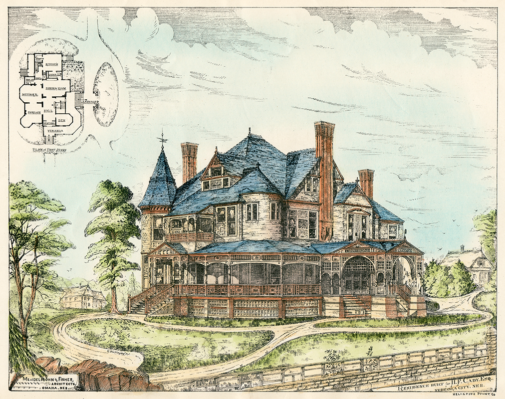 Description: H. F. Cady House, 1886, Nebraska City, Nebraska. Mendelssohn & Fisher, Architects; delineator, George Berlinghof. Hand colored engraving, 1886.