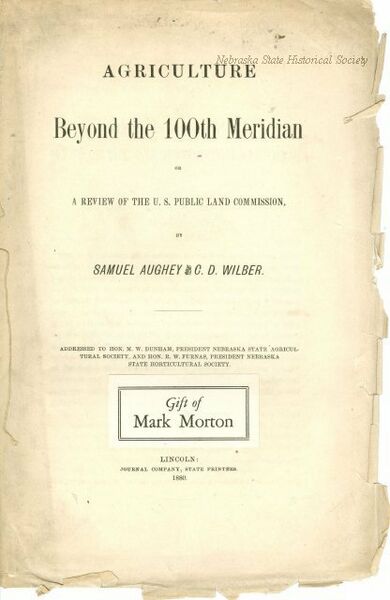 Description = Booklet titled “Agriculture Beyond the 100th Meridian or A Review of the U.S. Public Land Commission” by Samuel Aughey and C.D. Wilber. Gift of Mark Morton. Lincoln Journal Company, State Printers, 1880.
