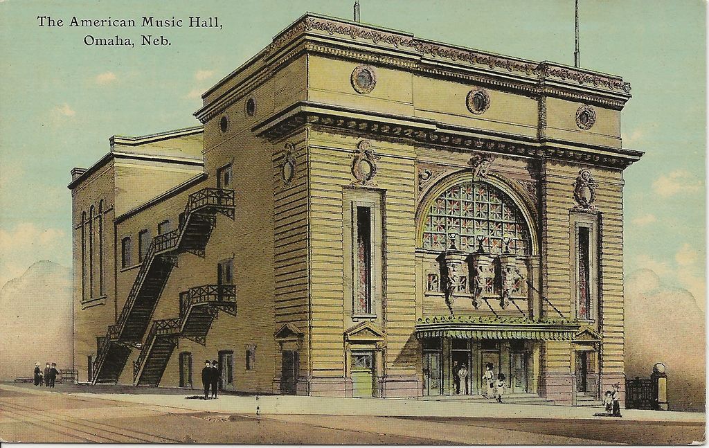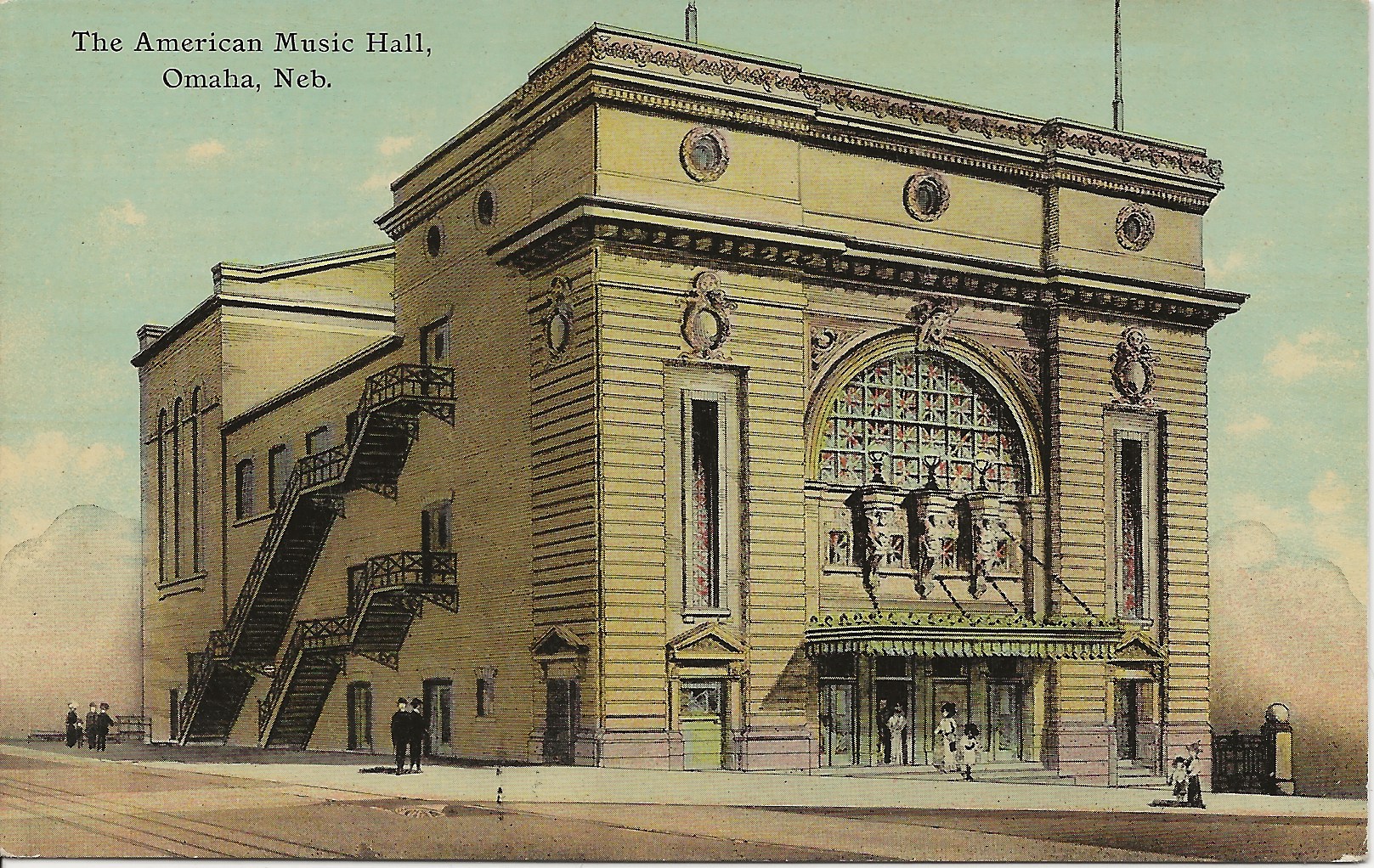 Heading: The American Music Hall, Omaha, Neb. Description: Perspective rendering of the American Music Hall, 18th & Douglas Streets, Omaha, Nebraska, E. C. Horn Sons, Architects & Contractors. Date: c. 1909 Source: Postcard, Zimmer Collection. Rights Usage Terms: Public, non-commercial use, with credit, is granted file names ending in ‘w’ no derivatives.