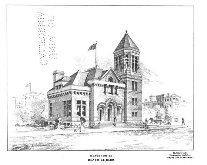 Heading: U. S. Post Office, Beatrice, Nebr. Description: Perspective drawing for Beatrice, Nebraska Post Office, inscribed W. J. Edbrooke, Supervising Architect, Treasury Department Date: 1891 Source: Annual Report of the Supervising Architect to the Secretary of the Treasury for the year ending September 30, 1891 (Washington: Government Printing Office, 1887), 28. Rights Usage Terms: Public, non-commercial use, with credit, is granted file names ending in ‘w’ no derivatives.