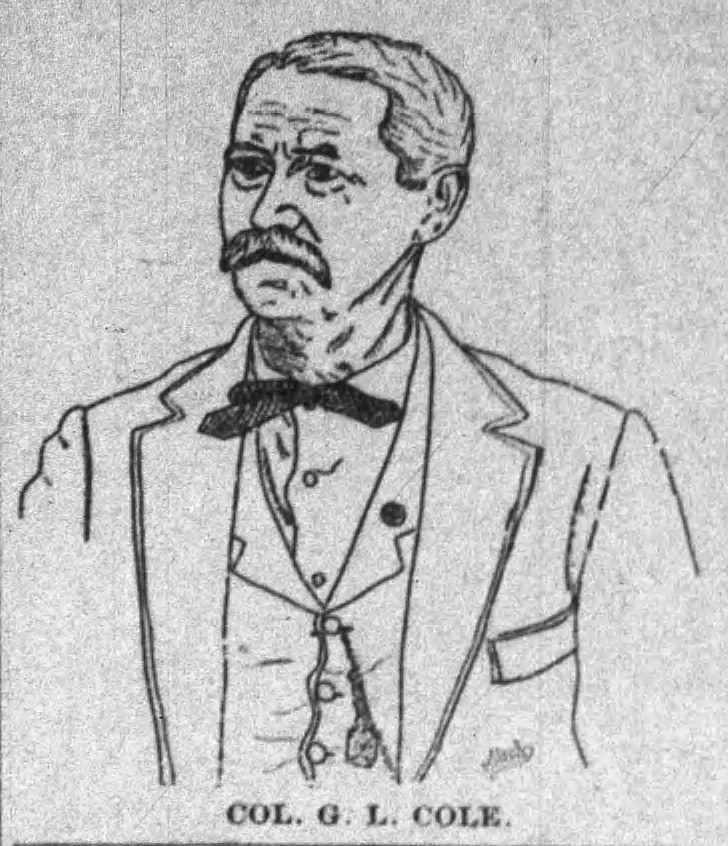 Heading: Gilbert L. Cole, 1893 Description: Line drawing (portrait) of "Col. G. L. Cole" Date: 1893 Source: Beatrice (Nebraska) Daily Express (March 21, 1893), 4. Rights Usage Terms: Public, non-commercial use, with credit, is granted file names ending in ‘w’ no derivatives.