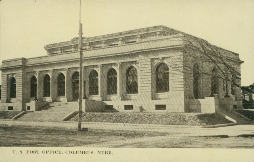Heading: "U. S. Post Office, Columbus, Nebr." Description: Postcard photo of Columbus, Nebraska, Post Office, James K. Taylor, Supervising Architect Date: n.d. Source: Nebraska State Historical Society, RG2405 (Platte County, Nebr.) 30806 Rights Usage Terms: Public, non-commercial use, with credit, is granted file names ending in ‘w’ no derivatives.