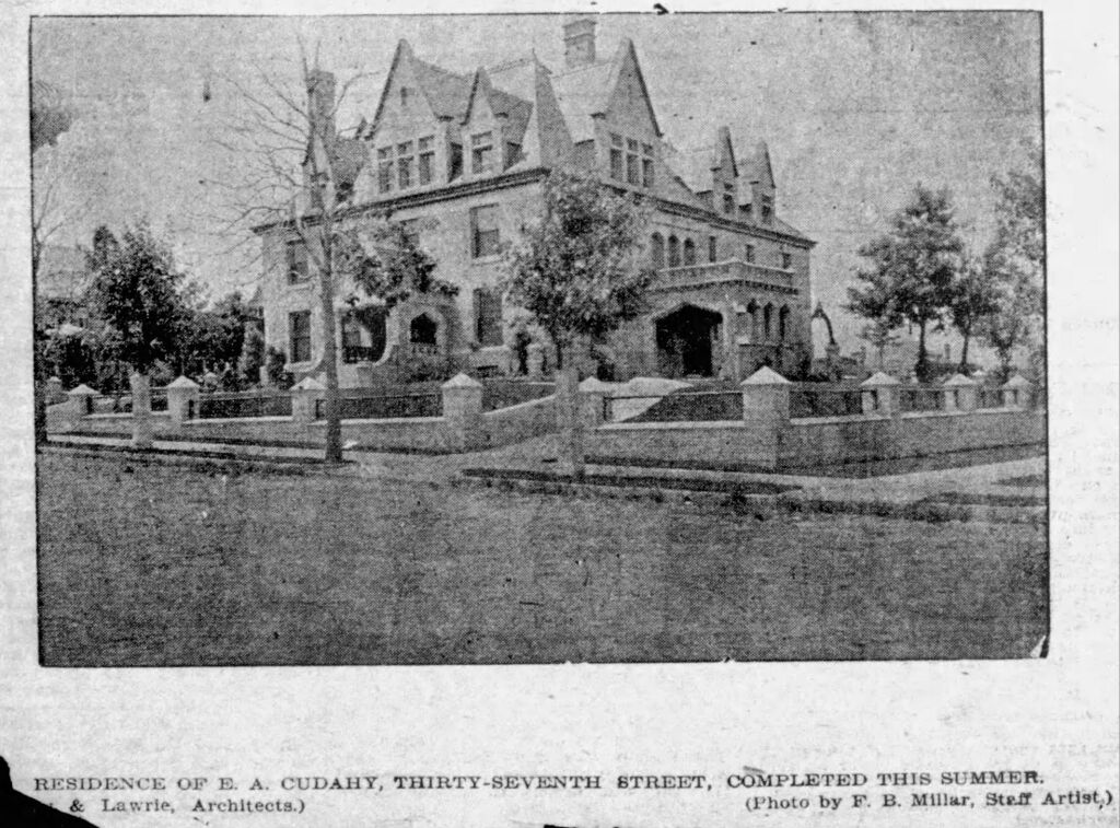 Heading: Residence of E. A. Cudahy, Thirty-Seventh Street, Omaha, Nebraska. Description: View of the newly built Cudahy mansion, designed by Henry Ives Cobb of Chicago. Date: 1899 Credit: Photo by F. B. Miller, Omaha World-Herald "Staff Artist" Source: Omaha World-Herald (July 23, 1899), 27 Rights Usage Terms: Public, non-commercial use, with credit, is granted file names ending in ‘w’ no derivatives.