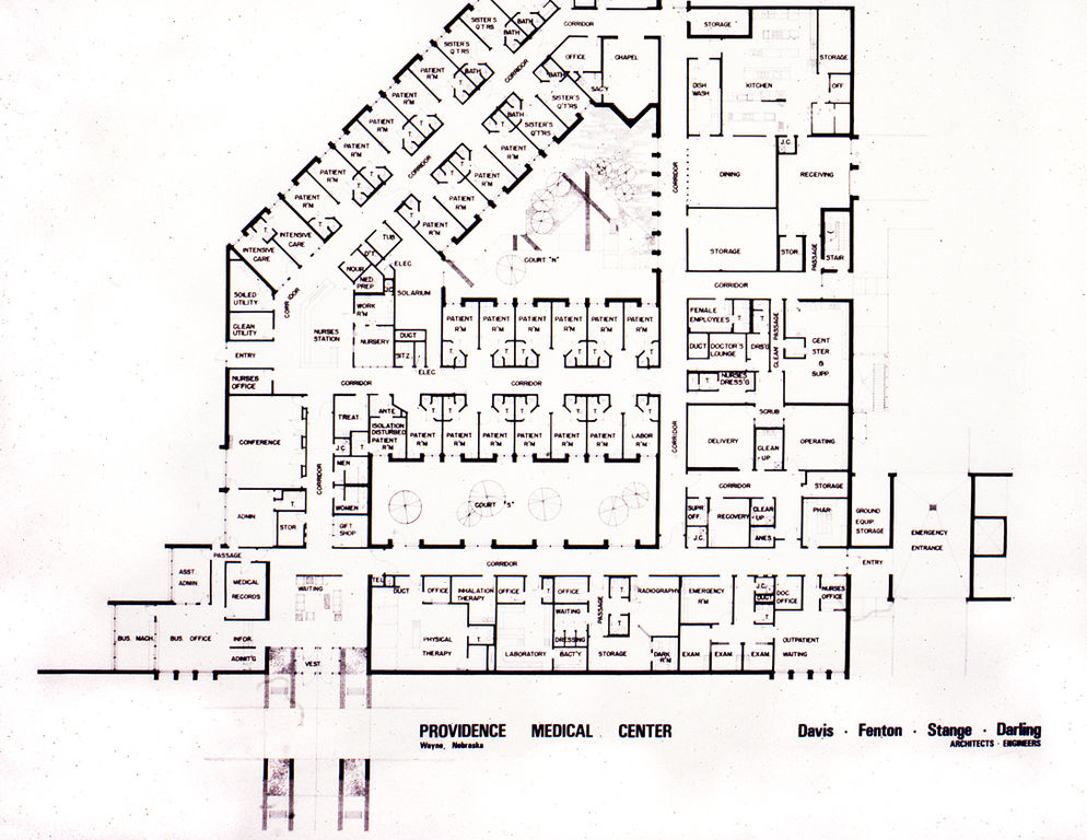 Description: Providence Medical Center (1973-1975)]], 1200 Providence Road, Wayne, Nebraska. Davis Fenton Stange Darling, Architects. Rendered floor plan; see colored rendering here.