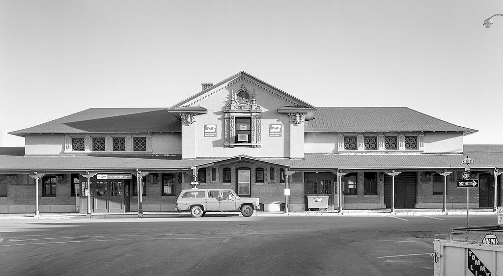 Description: Burlington Station (1900-1902), First Street and St. Joseph's Avenue, Hastings, Adams County, Nebraska. AD04-001 Thomas R. Kimball, Architect. Main (north) facade looking south.