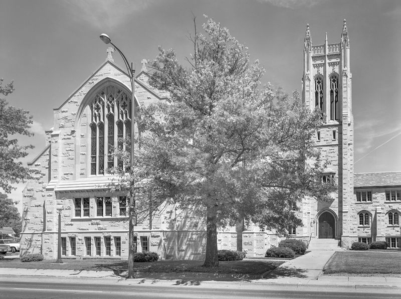 Description: Centenary United Methodist Church (1929), northeast corner of 6th and Elk Streets, Beatrice, Gage County, Nebraska. (GA03-246) Dougher, Rich & Woodburn, Architects, Des Moines, Iowa. West facade looking east-northeast.