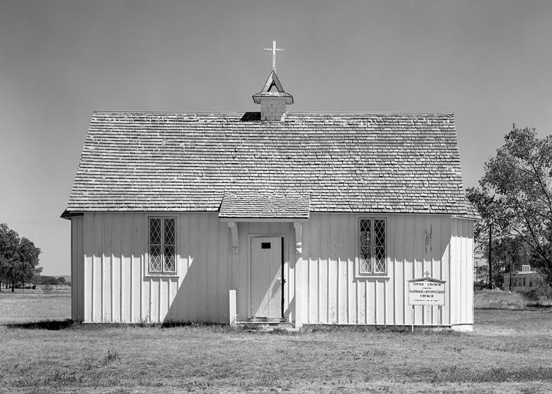 Description: Keystone Community Church, 1908, east side of McGinley between McCarthy and Fenwick, Keystone, Keith County, Nebraska. KH02-001. West entrance facade looking east. Thomas R. Kimball, Architect.