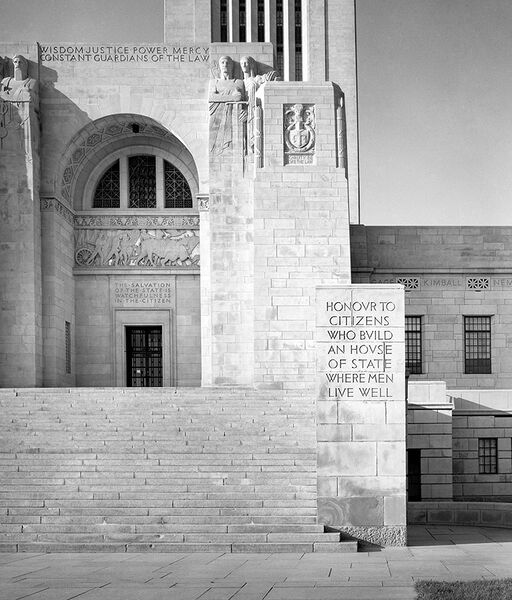 Description: Nebraska State Capitol, 1445 K Street, Lincoln, Lancaster County, Nebraska. 1919-1932. (LC13:D08-001) Bertram Grosvenor Goodhue (1869-1924), Architect. North entrance detail on west balustrade inscription.
