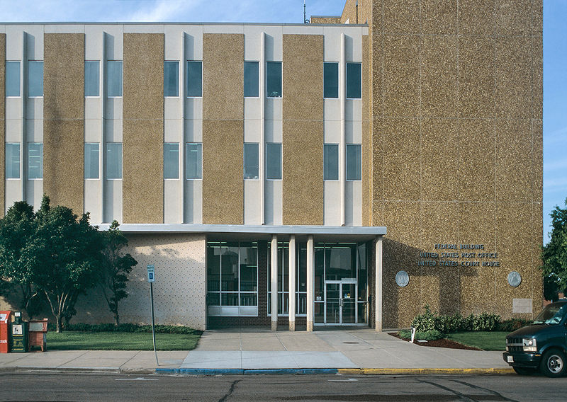 Description: U. S. Post Office and Courthouse (1963-64), North Platte, Nebraska. In association with Henningson, Durham & Richardson, Architects & Engineers; Detail of north entrance looking south. Robert Lyle Murphy, Architect. Wide view available here.