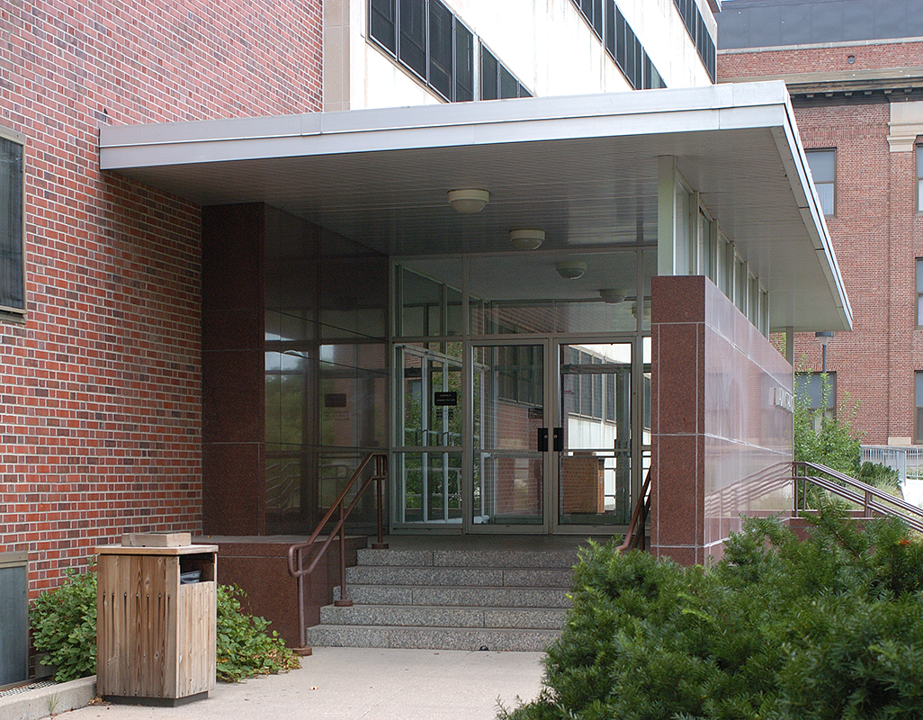 Description: Administration Annex (1953-1958), University of Nebraska City Campus, 14th & R, Lincoln, Nebraska. Hazen & Robinson, Architects. Detail entrance, east facade, looking north-northwest.