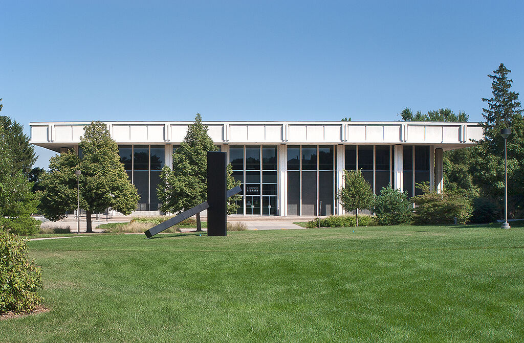 Description: C.Y. Thompson Library (1964), University of Nebraska, East Campus, Lincoln, Nebraska. Clark, Enersen, Olsson, Burroughs & Thomsen, Architects and Engineers. West facade looking east.