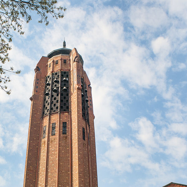 Detail view of the carillon tower, looking up and to the northwest from the entrance forecourt. Engaged statues of the four apostles appear atop the corner buttresses.