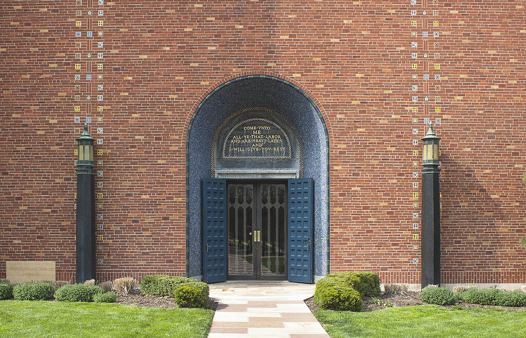 Description: First Plymouth Congregational Church (1928-1931), Lincoln, Nebraska. Harold Van Buren Magonigle (1867-1935), Architect, in association with Robert William McLaughlin, Jr. (1900-1989), Architect. (LC13:D07-045) Detail of the south facade, showing the inset entrance and light columns at the base of the bands of colored tile inserts.