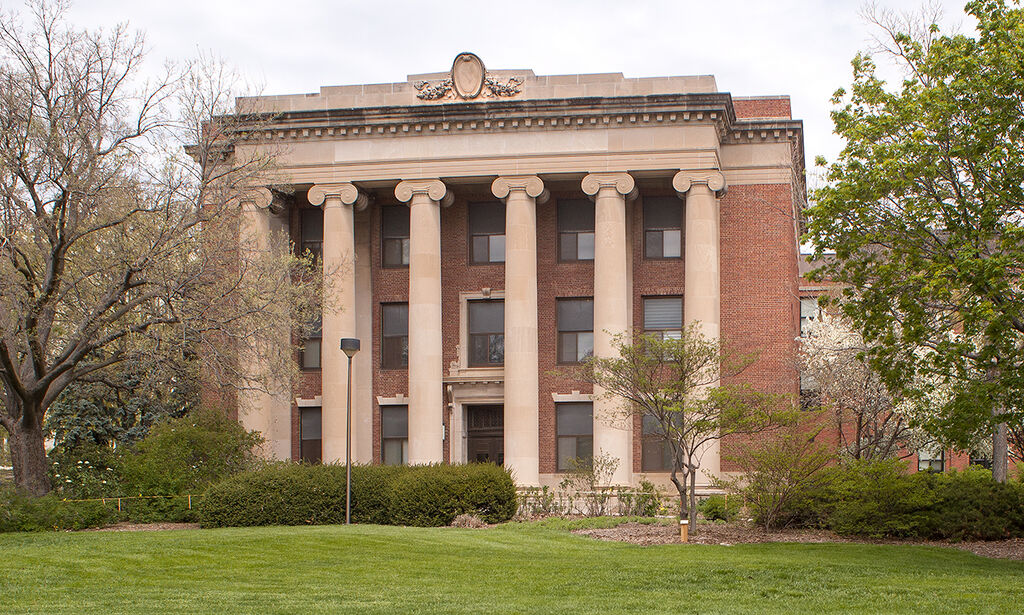 Description: Social Sciences Hall (1917-1919), University of Nebraska City Campus, 12th & R, Lincoln, Nebraska. Coolidge & Hodgdon, Architects. View of south (R Street) facade, looking north.