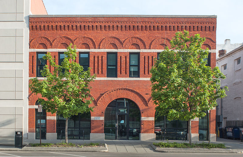 Description: Palace Livery Stable (ca. 1889), 1121 M St, Lincoln, Nebraska. John H. W. Hawkins, Architect. Now offices; all original windows and doors replaced. North facade looking south. D. Murphy Photograph May 2013.