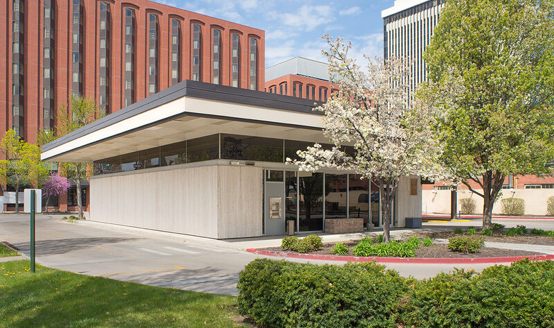 Description: First Continental National Drive-In Bank (1959), 344 South 13th, Lincoln, Nebraska. Clark & Enersen, Architects. Building permit 75694 of September 2, 1959, $105,000. View looking northwest. Photo by D. Murphy, April 2016.