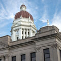Description: Seward County Courthouse (1904-1907), 6th & Main St., Seward, Nebraska. George A. Berlinghof (1858-1944), Architect. Detail of tower and dome, looking southeast. (SWO9-093) Photograph by D. Murphy, April, 2016. See also the view of the front facade.