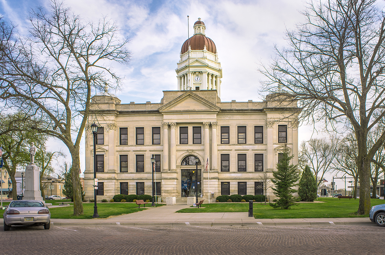 Description: Seward County Courthouse (1904-1907), 6th & Main St., Seward, Nebraska. George A. Berlinghof (1858-1944), Architect. (SWO9-093) North front facade looking south; the original windows have been replaced. See also the detail of the tower and dome. Photograph by D. Murphy, April, 2016.
