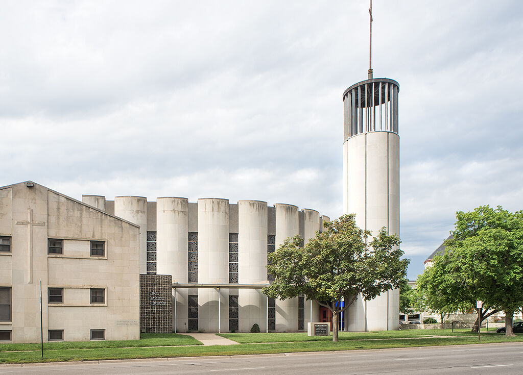 Description: First Baptist Church (1964), 1340 K Street, Lincoln, Nebraska. John Alden Shaver (1918-2010), Architect of Shaver & Company, Architects. City of Lincoln Building Permit #86830, June 16, 1964, $478,216. Kingery Construction Company, Contractors. View of the south facade, looking north, northeast. Photo by D. Murphy, May 2016.