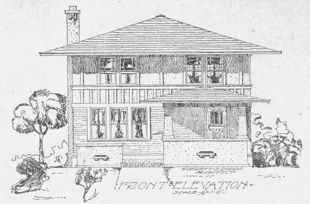 Heading: "Stucco and Shingle" by Everett S. Doods Description: Front elevation of hip-roofed, modified American Foursquare by E. S. Dodds, published in Omaha World-Herald. Date: August 3, 1913 Credit: E. S. Dodds Source: Omaha (Nebraska) World-Herald (August 3, 1913), 30. Rights Usage Terms: Public, non-commercial use, with credit, is granted file names ending in ‘w’ no derivatives.