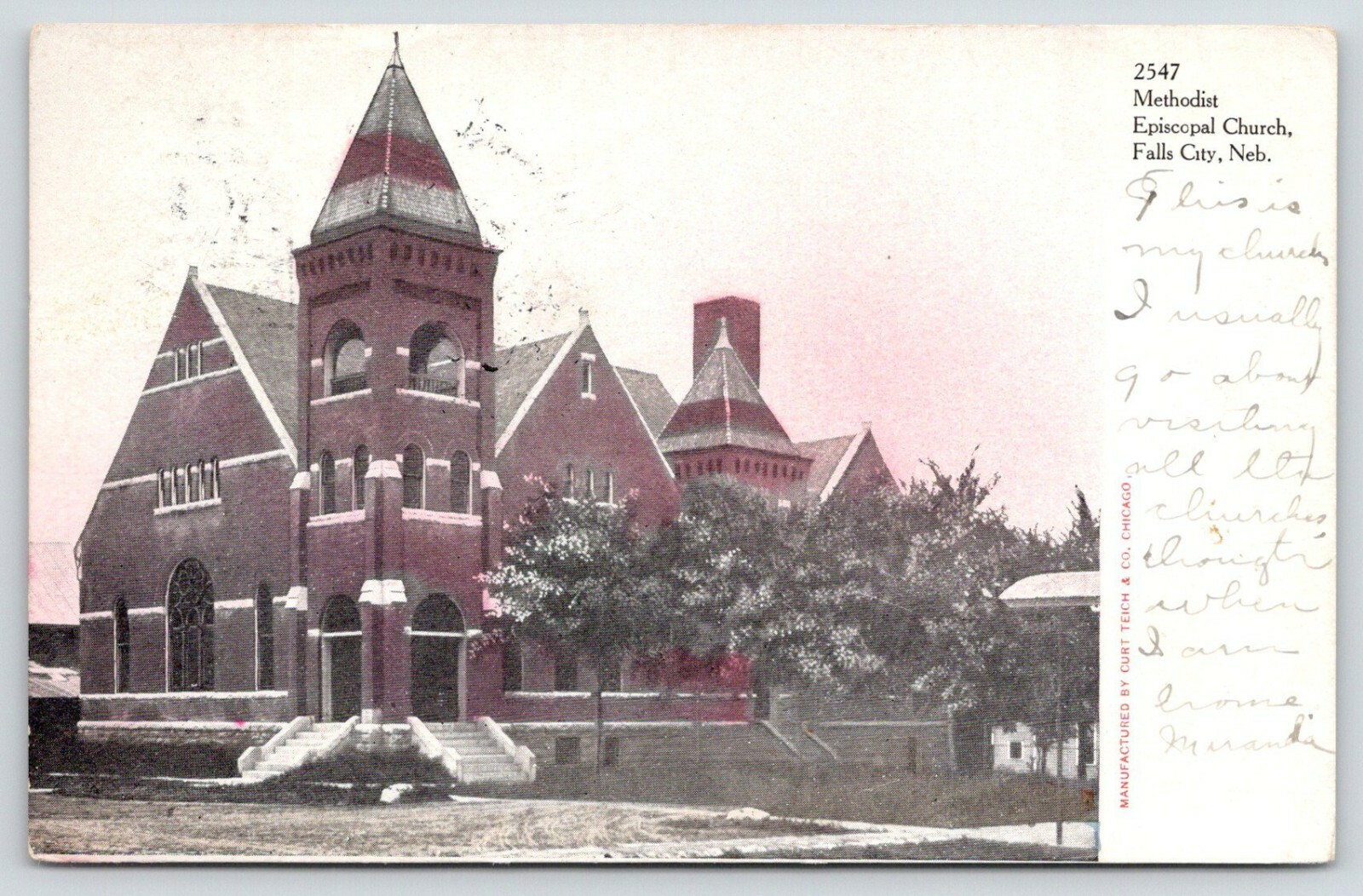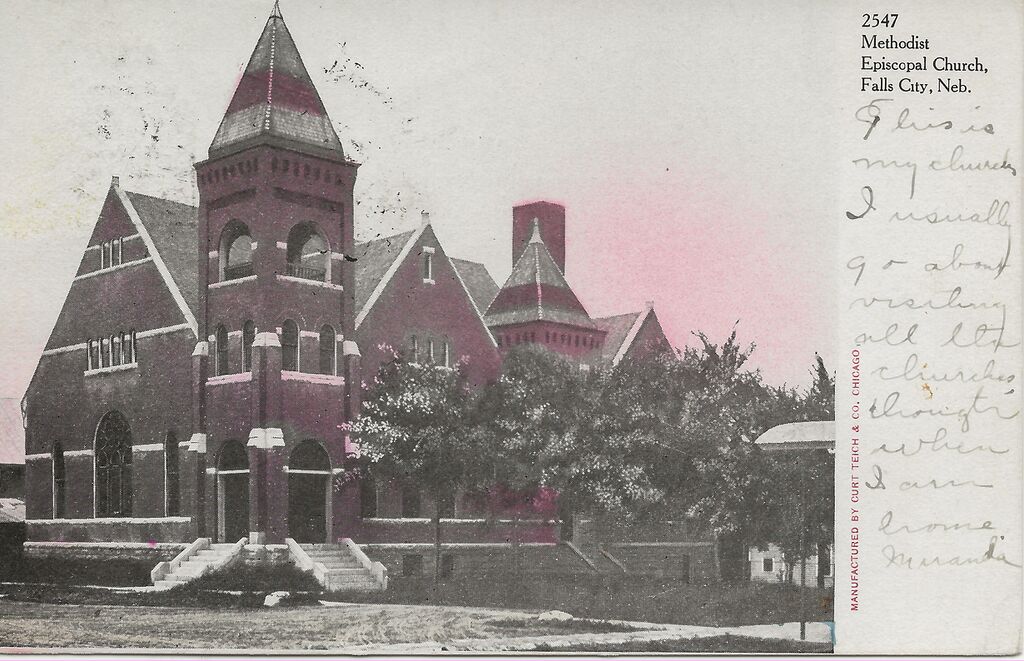 Heading: Methodist Episcopal Church, Falls City, Nebraska. Description: Tinted postcard view of Methodist Episcopal Church, Falls City, Nebraska, designed by Topeka architect J. C. Holland Date: ca. 1905-1910 Credit: Curt Tech & Co., Chicago, Illinois. Source: E. F. Zimmer postcard collection Rights Usage Terms: Public, non-commercial use, with credit, is granted file names ending in ‘w’ no derivatives.