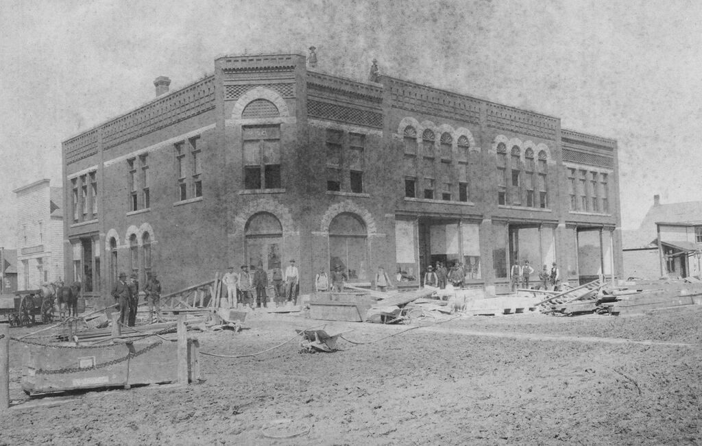 Heading: Farmers State Bank, Plainview, Nebraska. Description: Construction view of Farmers State Bank, Plainview, Nebraska; J. C. Stitt, architect. Date: 1891. Source: M. G. Hansen Collection. Rights Usage Terms: Public, non-commercial use, with credit, is granted file names ending in ‘w’ no derivatives.