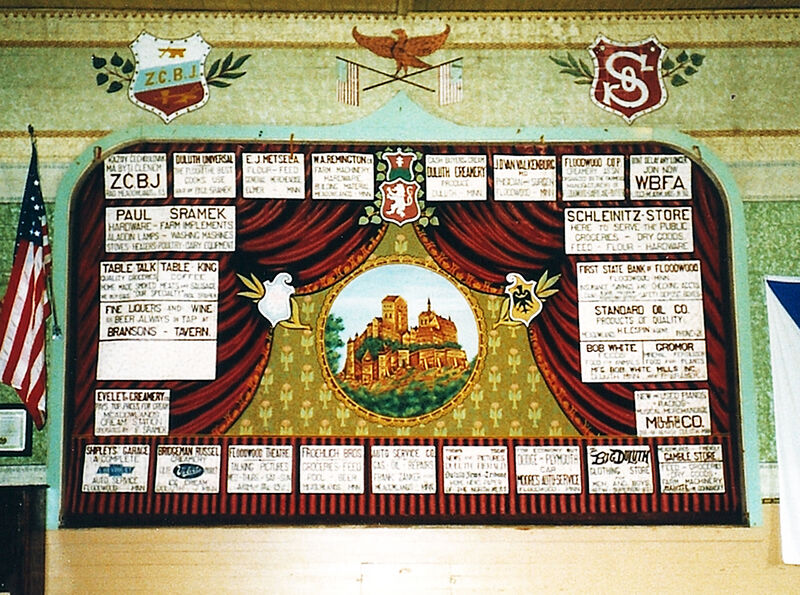 Description: Curtain & walls, Meadowlands ZCBJ Lodge National Hall (1929-1930), Meadowlands, Minnesota. Painted by Frank Joseph Fryzek, Muralist