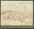 Description = This is a gathering of Native Americans near the Commercial Hotel in Rushville, Nebraska. A group of Sioux were leaving for tour on the wild west show circuit, and a large number of people gathered for two days to see them off. Everyone is in ceremonial clothing, including feathers and headdresses. Many of the men in front have pipes. A group of non-Indians can be seen in the immediate foreground, as well as lined against the buildings in the background. Several are seen on top of the building, as well. A water tower is viewable in the background.