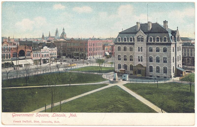 Heading: "Government Square, Lincoln, Neb." Description: Tinted postcard view looking southeast across Government Square, Lincoln, Nebraska, with U. S. Post Office by Mullett & Potter at right and granite fountain by J. G. Hill at junction on radial sidewalks. Date: ca. 1901-1904 Credit: "Frank DuTeil, Dist. Lincoln, Neb." Source: Collection of E. F. Zimmer Rights Usage Terms: Public, non-commercial use, with credit, is granted file names ending in ‘w’ no derivatives.