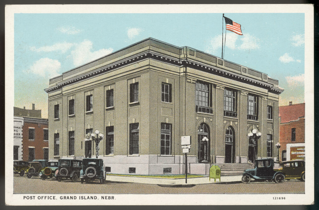 Heading: "Post Office, Grand Island, Nebr." Description: Colored postcard view of U.S. Post Office, Grand Island, Nebraska, James K. Taylor, Supervising Architect of the Treasury Date: c. 1920s Source: Nebraska State Historical Society, RG3451 (Hall County, Nebr.) 27885 Rights Usage Terms: Public, non-commercial use, with credit, is granted file names ending in ‘w’ no derivatives.
